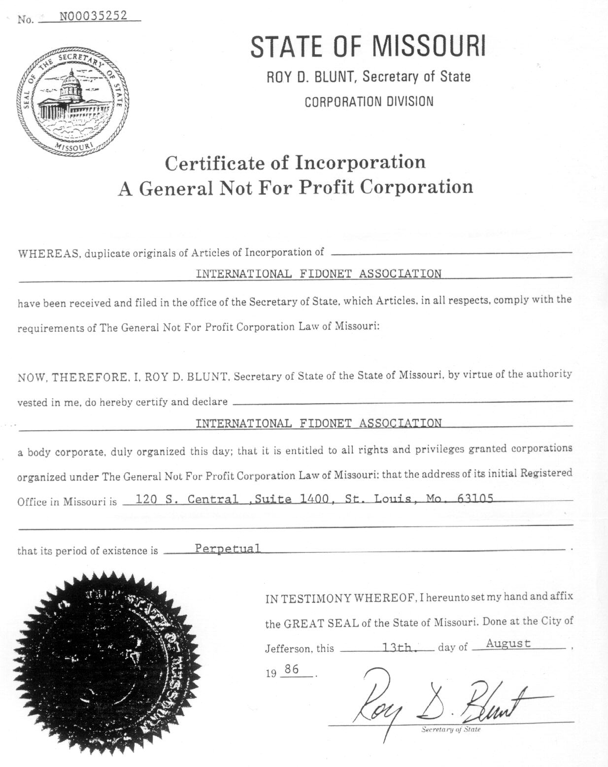 | Certification of International Fidonet Association (IFNA) (August 15, 1986) (Page 1)