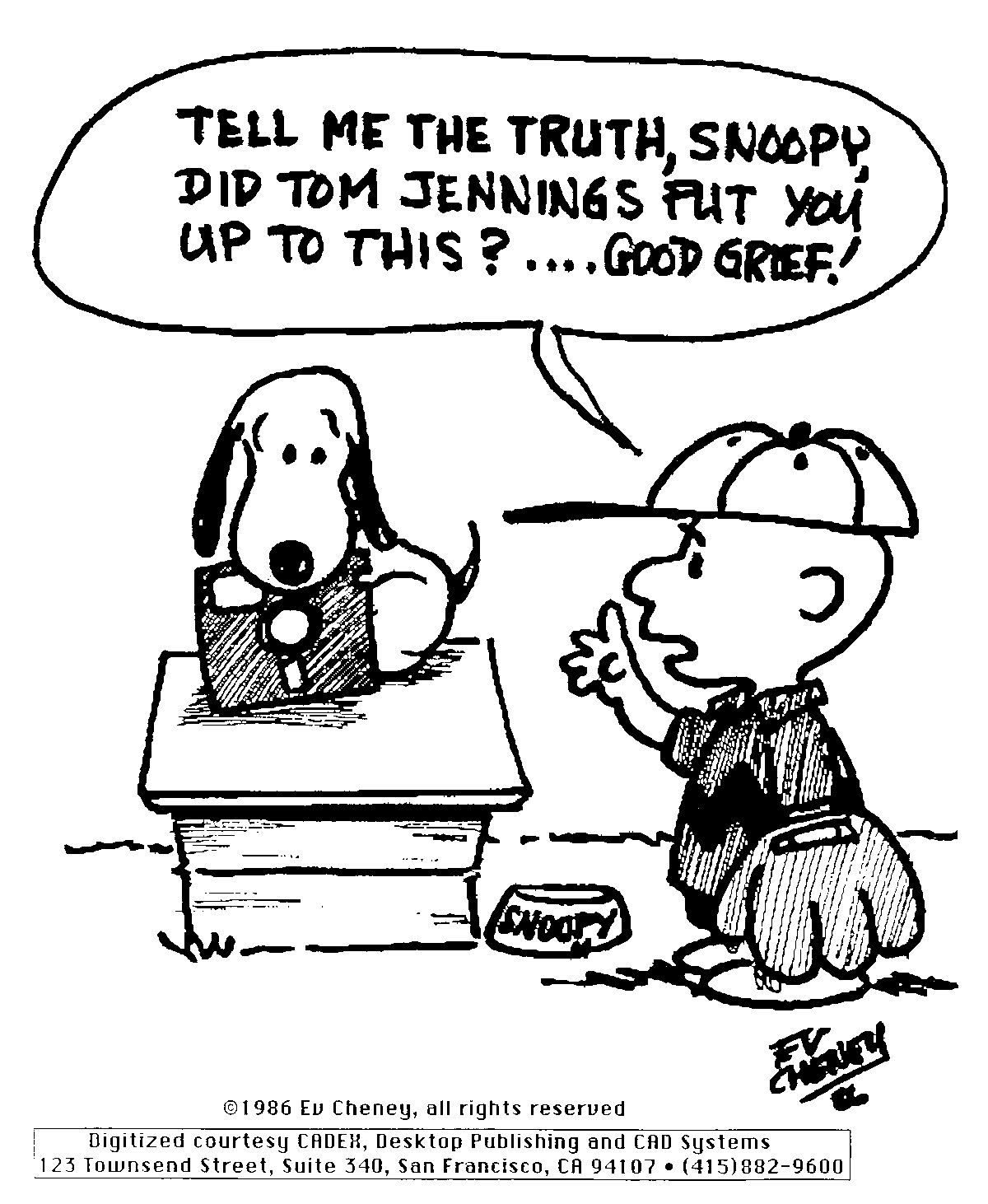 | Cartoon: "Tell Me the Truth, Snoopy: Did Tom Jennings Put You Up to This?" by Ev Cheney (1986)